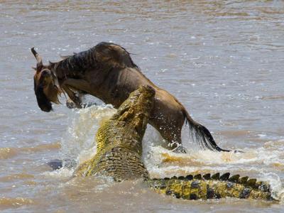 肯尼亚马赛马拉国家保护区角马迁徙横渡玛拉河途中遭鳄鱼偷袭 角马用尽全身力气...