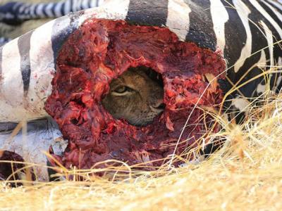 坦桑尼亚赛伦盖蒂平原狮子藏匿于斑马尸体