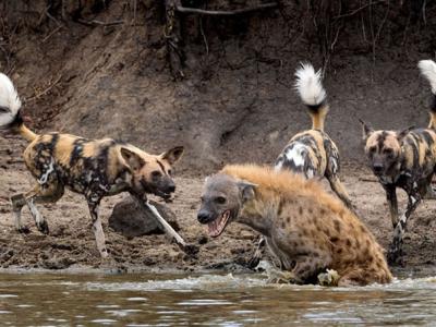 南非落单鬣狗被八只咆哮野狗赶下河 (神秘的地球报道)据环球网(实习编...
