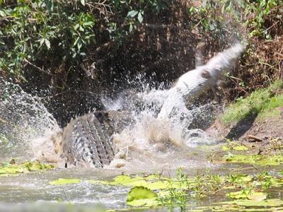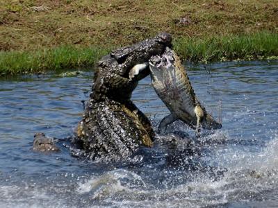 南非莱塔巴河大鳄鱼在河中发现幼年同类后