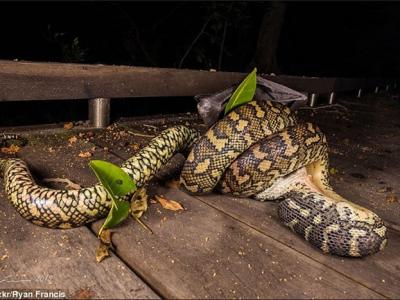 摄影师拍摄到一条巨型地毯蟒吞食一只黑狐蝠的惊人场景 今年2月份,在达尔文自...