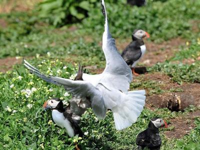 英国诺森伯兰郡海岸海鸥偷抢角嘴海雀的猎物