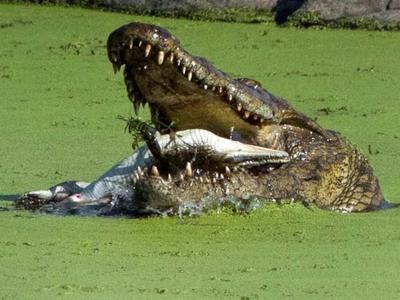 鳄鱼张开血盆大口,嘴里的鳄鱼幼崽已被咬死。 大鳄鱼吞食前先用自己锋利的牙齿...