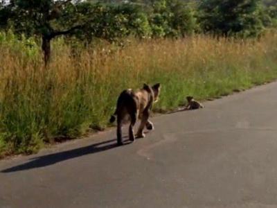 南非克鲁格国家公园母狮为保护其幼崽击退