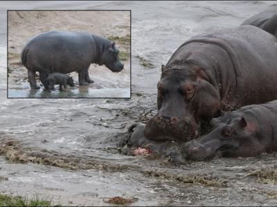河马宝宝被同类活生生咬死。小图为它早前与母亲待在一起。 河马宝宝被咬死的场...
