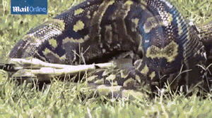 巨蟒慢慢咽下这头年幼的瞪羚。它吃完这个猎物的腿后,缓慢滑进附近的一条小溪。 ...
