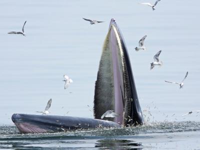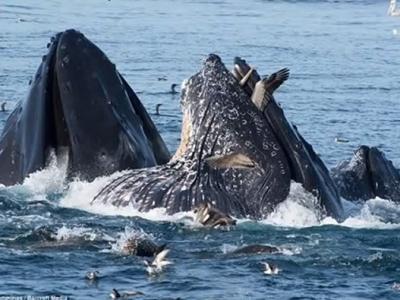 布氏鲸张嘴捕鱼 海鸥偷吃险遭吞下
