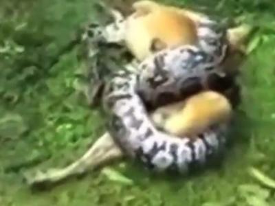 巨蠎紧紧箍着一只狗。 狗主伸出树枝,图解救爱犬。 巨蠎最终松绑,狗狗得以...