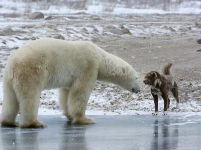守卫犬见北极熊走近,毫无惧色。 守卫犬摆出一副“战斗格”。 守卫犬无惧巨...