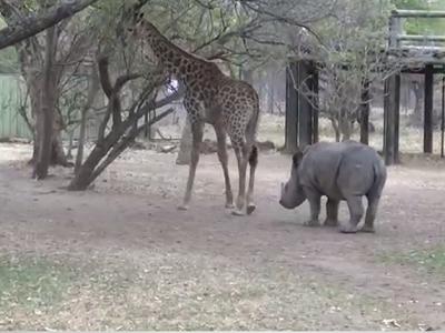 南非长颈鹿起飞脚 小犀牛落荒而逃