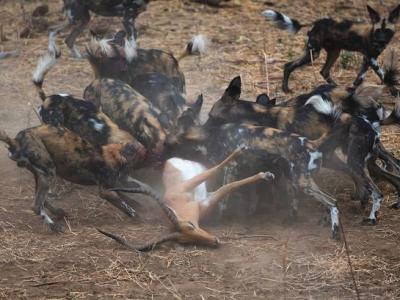 津巴布韦的马纳潭国家森林公园一群野狗和土狼群的晚餐争夺战 (神...
