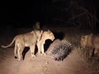 虽然有狮子对箭猪(中)有所动作,但仍动不了它分毫。 箭猪有时还会用尖刺反击,...
