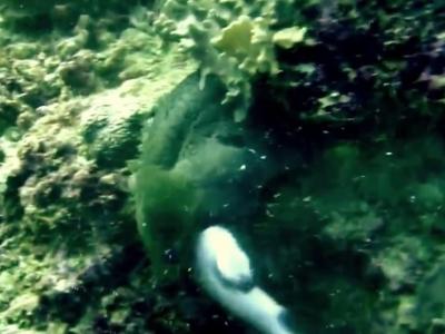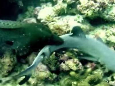巨海鳗噬住三齿鲨,欲整条吞下。 巨海鳗咬住三齿鲨,在海中摔来摔去。 巨海...