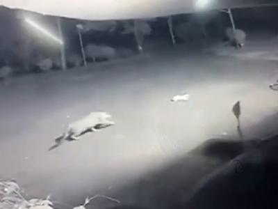 野豹(左)一步一步向小狗(右)走近 野豹火速扑倒小狗 可怜的小狗被最终被野豹...