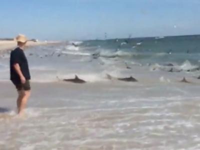 美国北卡罗莱纳州超过100只鲨鱼在浅滩上
