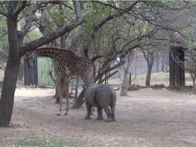 犀牛想跟长颈鹿玩,一直跟在它的后面。 长颈鹿「怒踹」刚好正中头部,犀牛痛到...