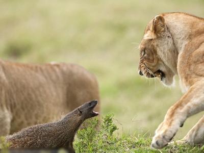 肯尼亚草原一只獴对峙4只狮子后全身而退
