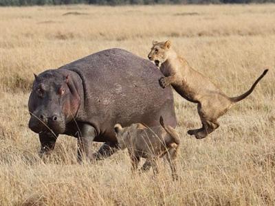 狮子群起攻击河马 河马被狮子迫得掉进一处泥泞 狮子穷追不舍,扑上河马背部...
