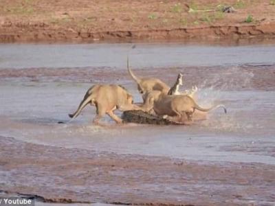 肯尼亚桑布鲁国家保护区上演狮子大战尼罗鳄 四只母狮与一头大象尸体 ...