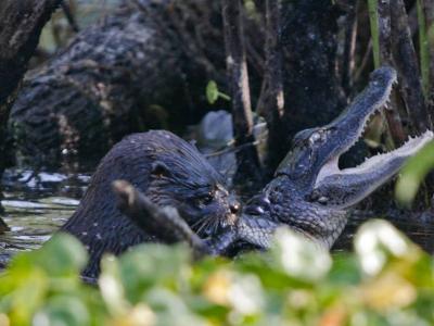 在佛州的伍德拉夫湖国家野生动物保护区,一只饥肠辘辘的水獭对水中的鳄鱼...