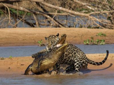 巴西特雷斯厄茂斯河上美洲豹猎杀凯门鳄