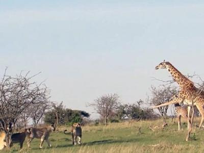 肯尼亚长颈鹿妈妈为护子飞腿吓退狮群