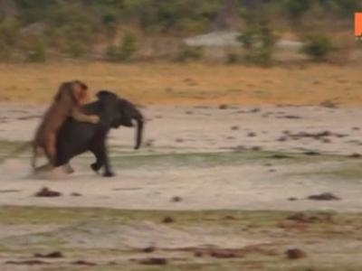 非洲小象因落单被两只狮子追捕成为晚餐吃掉