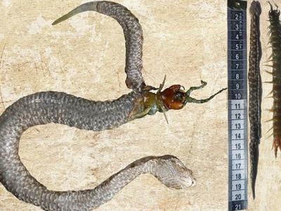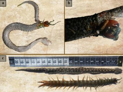 马其顿蜈蚣被蝰蛇吞食后破肚而出两败俱亡