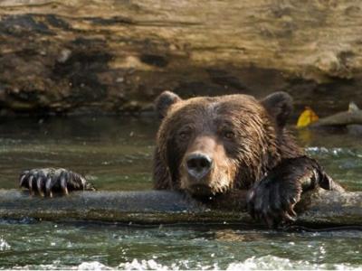 幼熊揽着浮木休息 休息完毕后,幼熊即叼到一条大三文鱼。 (神秘的地球)据香...