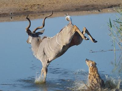 非洲纳米比亚伊托夏国家公园一只条纹羚为摆脱鬣狗追杀...