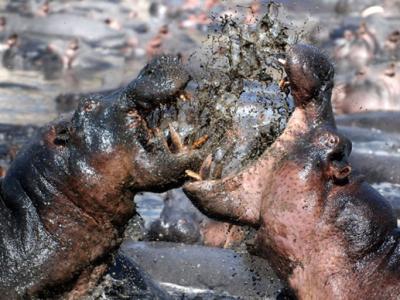 坦桑尼亚的卡维塔国家公园两头重达5吨的雄性河马展开激烈搏杀 (神...