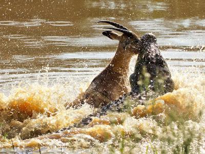 这张图展示了令人惊恐的一瞬间,无情的鳄鱼攻击并且很快杀死了一只试图过河的黑斑...