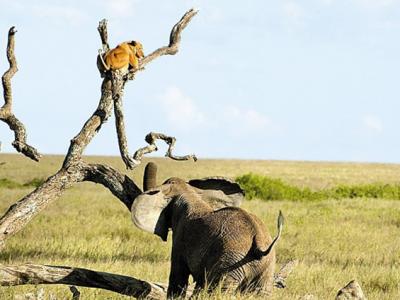 塞伦盖蒂大草原一头狮子被一头愤怒的大象追到了树上 (神秘的地球)据羊城晚报...