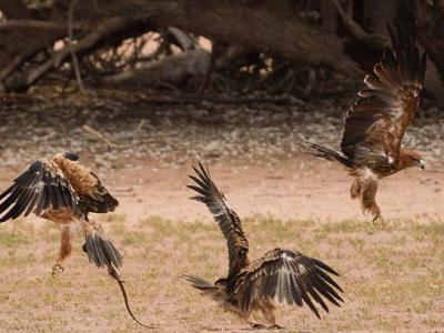 纳米比亚卡拉哈迪国家公园三只鹰争夺一条