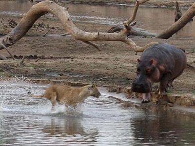 赞比亚卢安瓜国家公园狮子遭河马拦路落荒