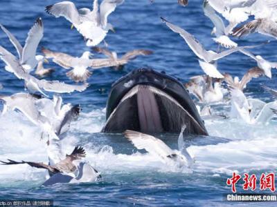 银鸥从鲸鱼的口中夺食 (神秘的地球)据CFP视觉中国:美国马萨诸塞州,摄影...