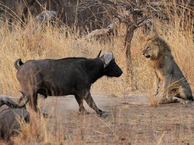 一头水牛向交配中的雄狮发起进攻并将其抛