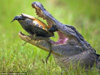 英国《每日邮报》4月25日刊登这样一组鳄鱼与乌龟比拼“耐力”的照片:一只南美短吻...