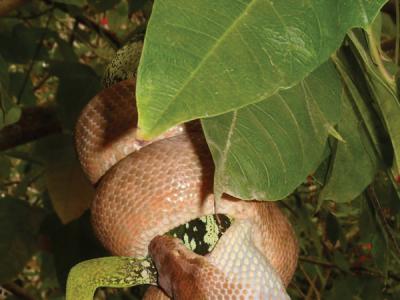 斐济群岛的蟒蛇捕食濒危的斐济鬣蜥
