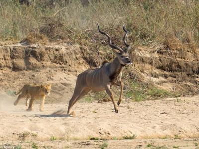 南非玛拉玛拉野生动物保护区狮群围捕弯角羚