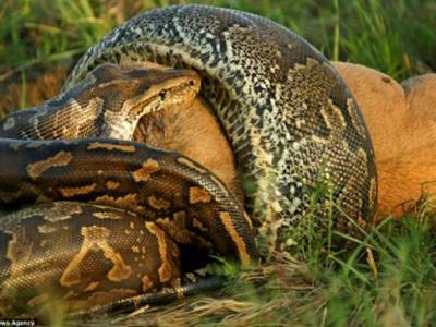 这条非洲巨蟒缩紧肌肉缠绕住羚羊身体,张开大嘴欲将其吞食。 巨蟒在牙齿的帮助...
