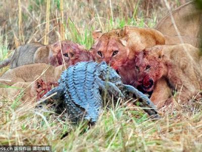 鳄鱼要在一群狮子口中抢食 摄影师在赞比亚南卢安瓜地区拍摄到了一只大胆的鳄鱼试...