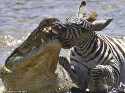 鳄鱼冒出水面,迅猛地咬住一头斑马的下颚 迁徙的斑马群渡过肯尼亚的一条河流 ...