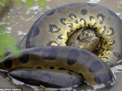 委内瑞拉一条巨型水蟒捕猎乌龟