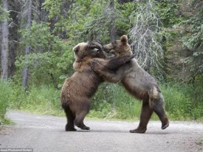 美国阿拉斯州两头棕熊为争食鲑鱼进行拳击