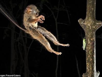印度尼西亚唐可可国家公园眼镜猴捕猎蚱蜢