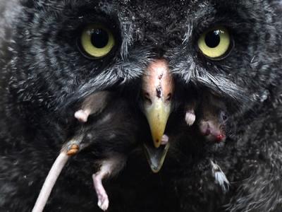 柏林动物园,一只幼年灰枭捕捉到了一只老鼠。
