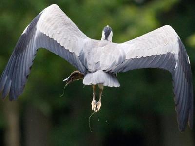 爱尔兰都柏林,一只苍鹭叼住了一只小水鸭,幸运的是,小水鸭从它的口中逃脱。