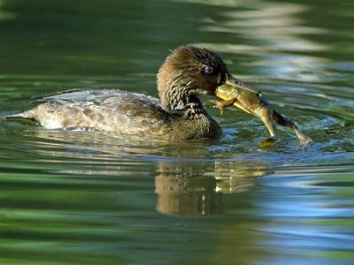 加拿大蒙特利尔,一只水鸭捕捉到了一只牛蛙。