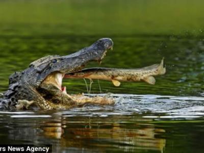 美国一条倒霉的雀鳝跃出水面直接落入短吻鳄口中 美国一条倒霉的雀鳝跃出水面直...